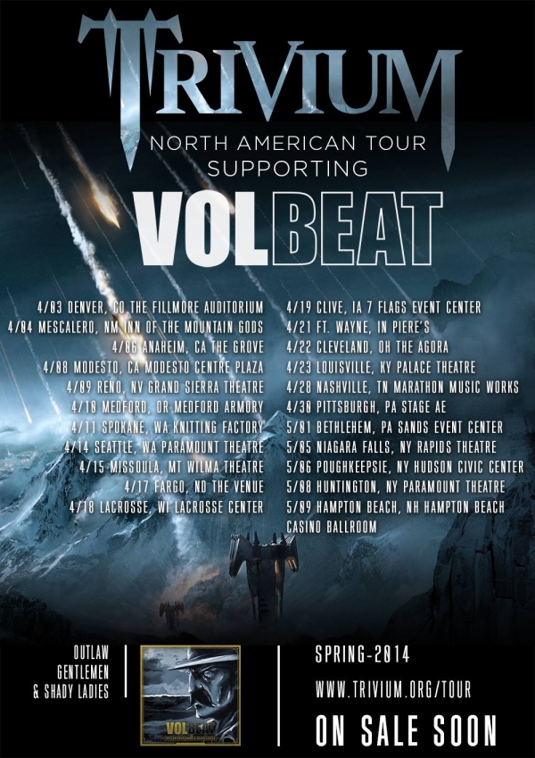 Trivium se complace en anunciar que se unirá a Volbeat como invitado especial del quinteto de Dinamarca a América del Norte el 3 de Abril para una gira de costa a costa de los EE.UU. El recorrido comienza en The Fillmore en Denver, CO, y terminará la segunda semana de Mayo, sobre la costa este. También apoyando se encuentra Digital Summer. Las fechas de la gira están a continuación. Manténganse atentos a los enlaces de entradas y la información de compra.