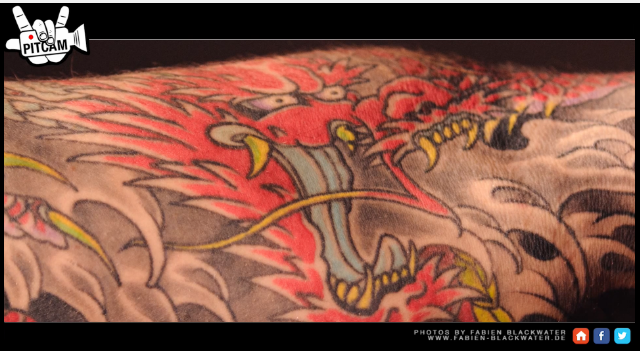 “Eso es un poco complicado de responder; sólo tengo tres: mi brazo derecho, mi brazo izquierdo y éste (el dedo anular). El primero que me hice fue el del brazo derecho y representa al ‘Dragón Ascendente’ (‘Ascending Dragon’) de Kitagawa Utamaro; es una pieza japonesa de finales de los 1800. Ese artista tradicionalmente pintaba Geishas, pero cuando vi la pieza y como íbamos a lanzar un álbum llamado ‘Ascendancy’ como que tuvo sentido, además de que quería que mis tatuajes tuvieran temática japonesa al ser yo mitad japonés. Primero me hice sólo el contorno – dos horas y media, y nunca sentí un dolor tan intenso como ése, no lo disfruté para nada. No he vuelto a ver al tipo desde que lo coloreó. Sé que todavía tatúa pero no sé dónde está. Creo que el baterista de Battlecross es amigo suyo, así que tendré que preguntarle. Algo me decía que no lo volvería a ver, así que pasé por un proceso de coloreado de ocho horas y media; se me inflamó como medio centímetro y al día siguiente tenía que volar de un lado al otro del país. La primera pieza fue hecha por Brian Bruno en Tattoo City en San Francisco, y creo que ahora él está en Virginia. El tatuaje del brazo izquierdo fue hecho por Kahlil Rintye en Tattoo City en San Francisco; es una pieza que representa al samurai Watanabe no Tsuna peleando contra el demonio Ibaraki en la Puerta de Rashomon, así que fue una verdadera representación de la pieza. Kahlil nunca había hecho ese tatuaje ni lo habíamos visto en ningún lado, así que ambos nos gustó. Está basado en un tríptico japonés antiguo del que incluso mi mamá conocía la historia y yo la aprendí de niño, y trata sobre un samurai que pelea contra un demonio en una puerta, por eso el título. Luego el demonio de Rashomon se disfraza de mujer vieja para poder recuperar su brazo y así la historia continúa. Si alguien busca la pieza original se ve muy similar a la de mi brazo. Fueron cuatro sesiones de cerca de siete horas por pieza (7 horas contorno, 7 horas coloreado…) y luego tuvo el permiso de Brian Bruno para terminar la pieza del dragón (brazo derecho).”