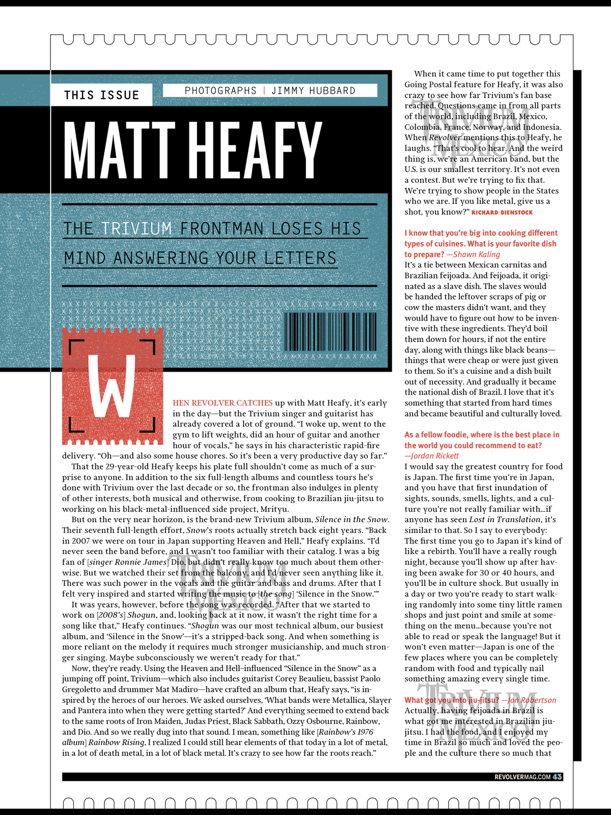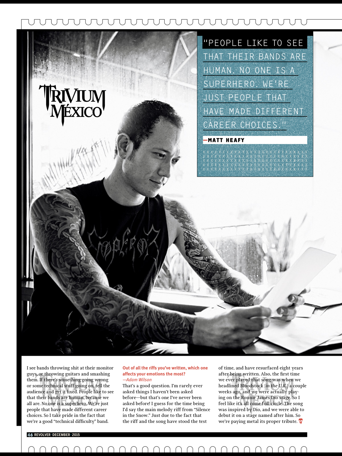 Cuando llegó la hora de organizar este reportaje sobre Heafy, fue una locura ver lo lejos que se ha extendido la base de fans de Trivium. Vinieron preguntas de todas partes del mundo, incluyendo Brasil, México, Colombia, Francia, Noruega e Indonesia. Cuando Revolver le mencionó esto a Heafy, él rió. “Es genial escuchar eso. Y lo raro es que somos una banda estadounidense, pero los Estados Unidos son nuestro territorio más pequeño. Ni siquiera es un concurso. Pero estamos tratando de arreglar eso. Estamos tratando de mostrar a la gente en los EE.UU. quiénes somos. Si les gusta el metal, dennos una oportunidad, ¿saben?”