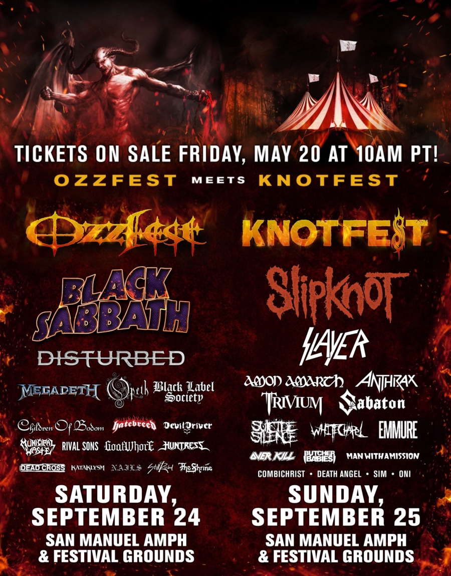 Todavía no estamos seguros de cómo está el asunto, pero en una conferencia de prensa se ha informado de una especie de fusión de los famosos festivales Ozzfest y Knotfest, fundados por Ozzy Osbourne (Black Sabbath) y Slipknot, respectivamente. Ambos festivales tienen su propia historia escrita por separado, así que esta unión sin duda será épica. El festival llamado Ozzfest Meets Knotfest será realizado en San Bernardino, California los próximos 24 y 25 de septiembre del presente año; el cartel de las bandas confirmadas está publicado en la parte superior de esta entrada, y Trivium figura en el segundo día del evento (domingo 25 de septiembre) junto a bandas como Slipknot, Slayer, Amon Amarth y Anthrax, entre otras. Felicidades a nuestros muchachos, ya que sin duda están colocándose cada vez más y más arriba en ese tipo de shows en la unión americana.