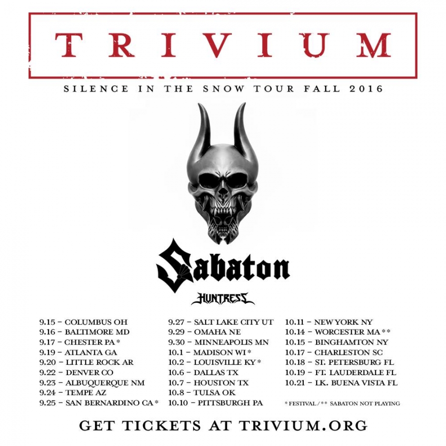 TRIVIUM ha anunciado los detalles de su gira headliner de otoño por los Estados Unidos. El tour, el cual inicia el 5 de septiembre en el Newport Music Hall de Columbus, Ohio, presentará a los invitados especiales SABATON y HUNTRESS. Los boletos de la preventa estarán disponibles a partir del jueves 14 de julio a las 10:00 a.m. hora local, y la venta general el sábado 16 de julio a la misma hora. Mientras se presentan en la gira headliner, Trivium también estará participando en algunos festivales en la Unión Americana: Rock Allegiance (17 de septiembre), Ozzfest Meets Knotfest (25 de septiembre), JJO Sonic Boom (1 de octubre), Louder Than Life (2 de octubre) y Rock & Shock (14 de octubre).