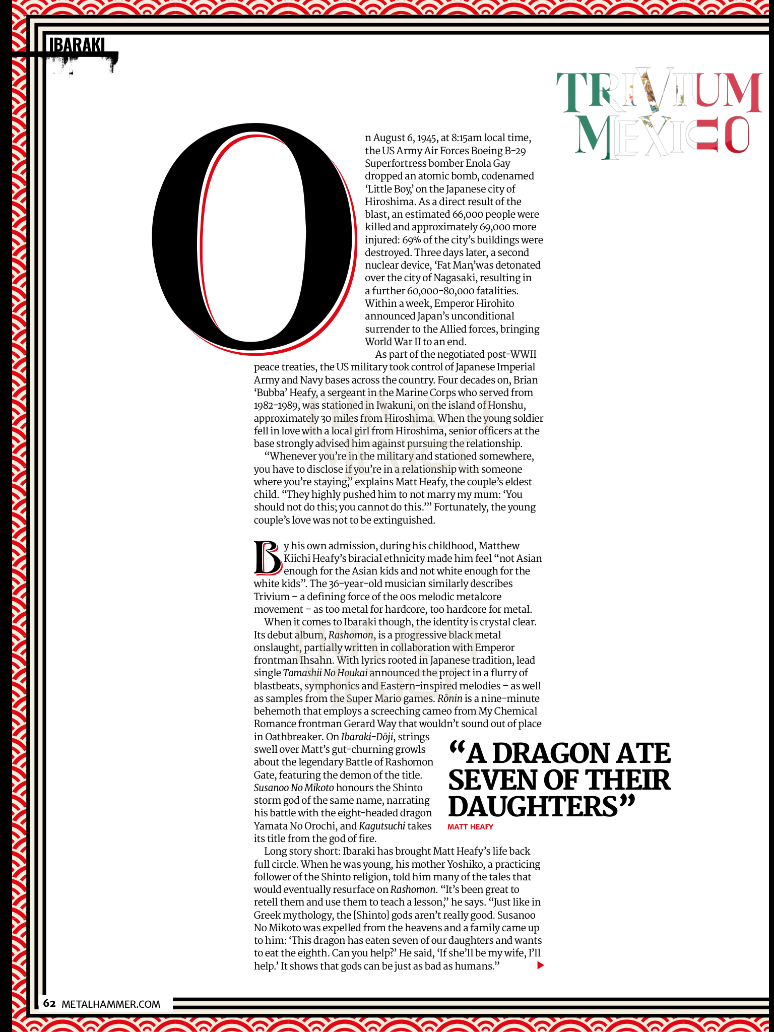 En resumen: Ibaraki ha vuelto a cerrar el círculo de la vida de Matt Heafy. Cuando era joven, su madre Yoshiko, una seguidora practicante de la religión sintoísta, le contó muchas de las historias que eventualmente resurgirían en Rashomon. “Ha sido genial volver a contarlas y usarlas para enseñar una lección,” dice. “Al igual que en la mitología griega, los dioses [sintoístas] no son realmente buenos. Susanoo No Mikoto fue expulsado de los cielos y una familia se le acercó: 'Este dragón se ha comido a siete de nuestras hijas y quiere comerse a la octava. ¿Puedes ayudarme?’ Él dijo: ‘Si ella va a ser mi esposa, yo les ayudaré’. Eso demuestra que los dioses pueden ser tan malos como los humanos.”