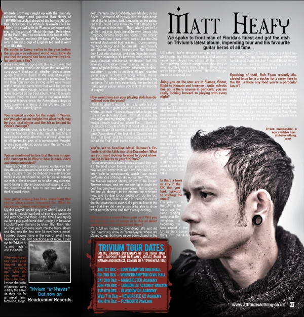 Attitude Clothing se encontró con el increíblemente talentoso cantante y guitarrista Matt Heafy de Trivium para una charla antes del tour de la banda por el Reino Unido este diciembre. Los favoritos de Attitude estarán de gira junto a In Flames entre otros en el tour anual de Metal Hammer, “Defenders Of The Faith”, para desatar su más reciente entrega “In Waves” a sus fans del Reino Unido. Tuvimos la plática bebiendo un rico té inglés y esto fue lo que pasó...